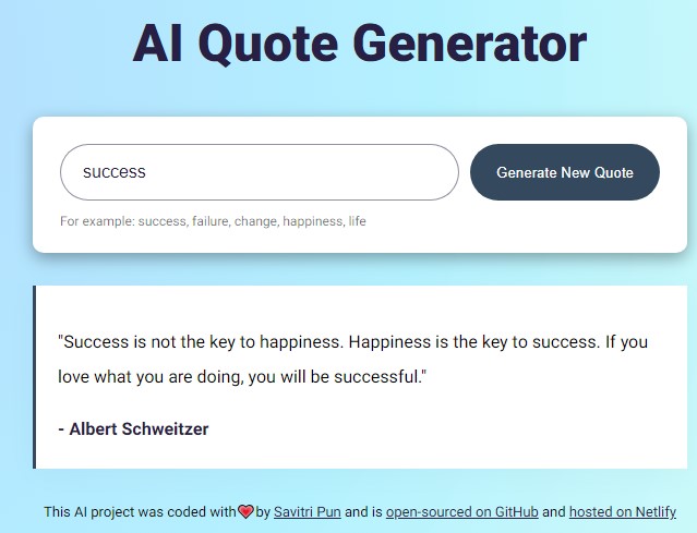 The AI Quote Generator is a one-page online application that generates quotes based on the user's unique interests. In order to enhance the user experience, we have included an example of keywords such as success, happiness, life, and so on. This helps users discover the required quote easily.Additional functions, such as setting a timer a notification informing the user that a quote is being generated will appear as AI generates quotes for them. Please be patient.