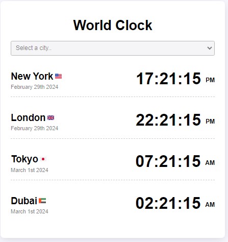 This web application ,World Clock, allows users to view their current location, date, and time. Additionally, users can see the current time and date for other cities by choosing from a list of provided cities.